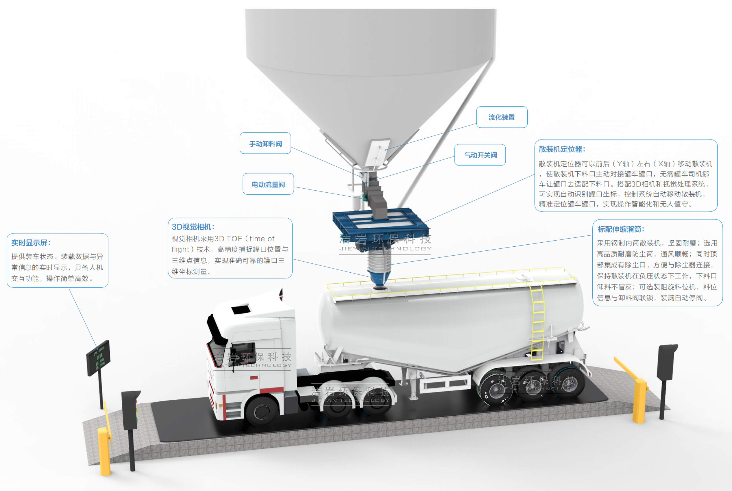 TF-S系列粉料免移車自動裝車系統(單罐口版)是針對粉料裝車定制設計的一套高度集成的自動化裝車解決方案,整個系統由料倉、流化裝置、閥門裝置、散裝機定位器、TE系列散裝機、除塵器、稱重系統、電氣控制系統等組成。通過智能定位、精確對接和自動控制,裝車散裝機可實現前后(Y軸)、左右(X軸))多維度靈活移動,下料口自動對接罐車罐口,無需司機頻繁移車,極大提升裝車效率,降低人工干預,保障裝車精準性與安全性。