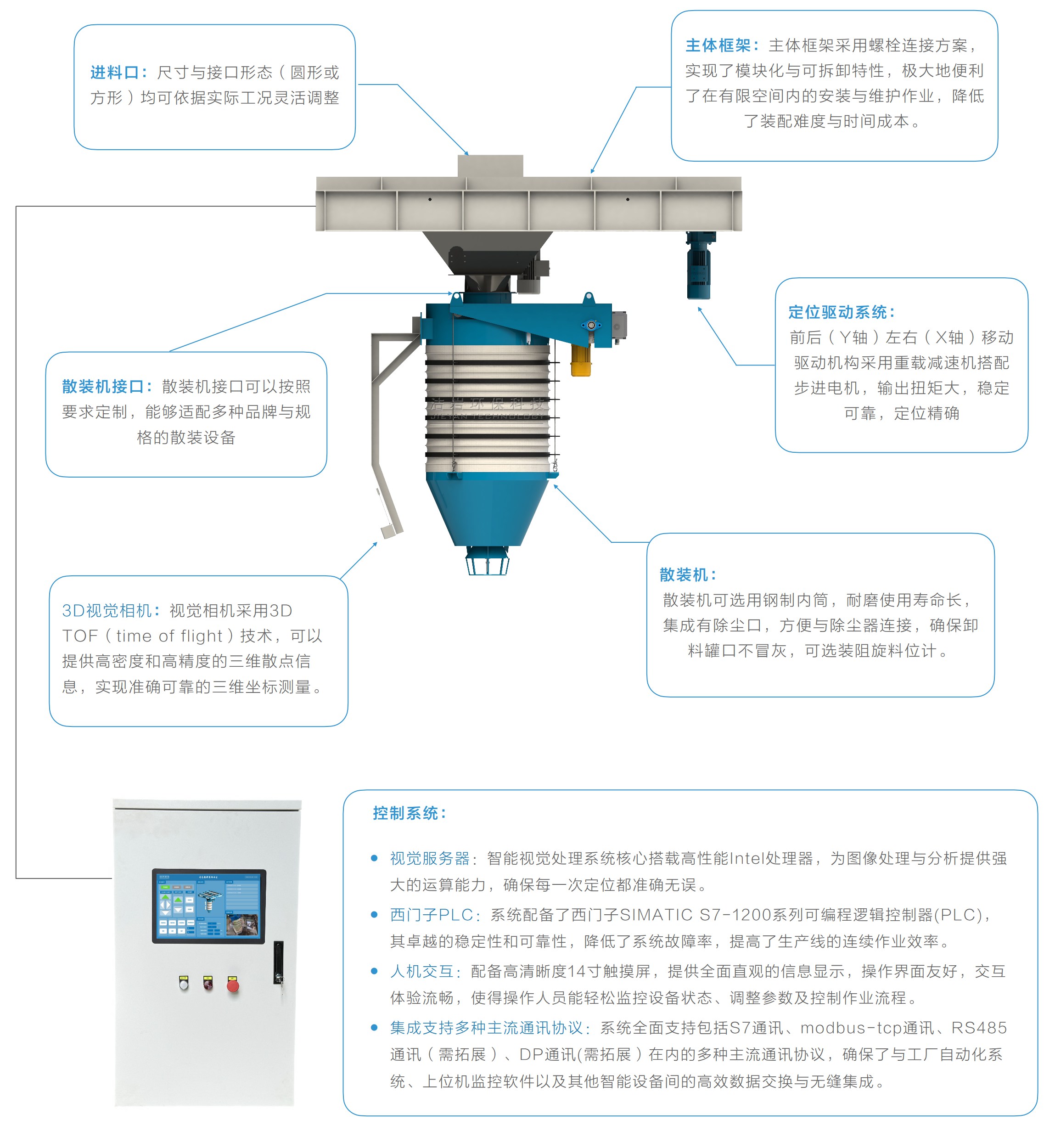 散裝機智能視覺定位系統(tǒng)它主要用以解決散料裝卸過程中散裝機和罐車對接難度高、對接效率低下、安全風險高的難題。它主要組成部分是機器視覺定位系統(tǒng)和智能運動控制系統(tǒng),在罐車停靠之后,定位系統(tǒng)集成的高分辨率3D視覺相機開始工作,視覺服務器通過圖像識別技術快速捕捉并分析罐口的精確位置和形狀特征,計算出罐口在三維空間中的精確坐標,然后運動控制系統(tǒng)精確控制散裝機的移動方向和速度,平滑、迅速地移動到目標罐口上方,確認無誤后,PLC系列控制散裝機下落,散裝機和罐口對接完成。該系統(tǒng)能顯著減少司機的工作量,降低了對司機的技能要求,提高了裝卸效率,降低了安全風險。